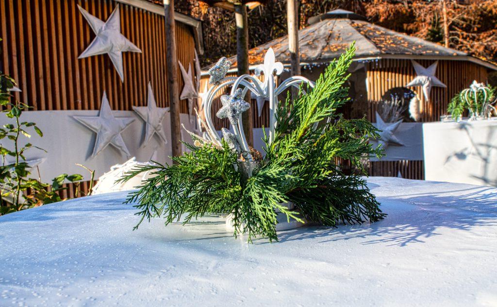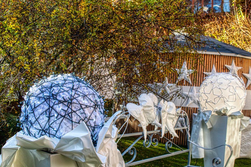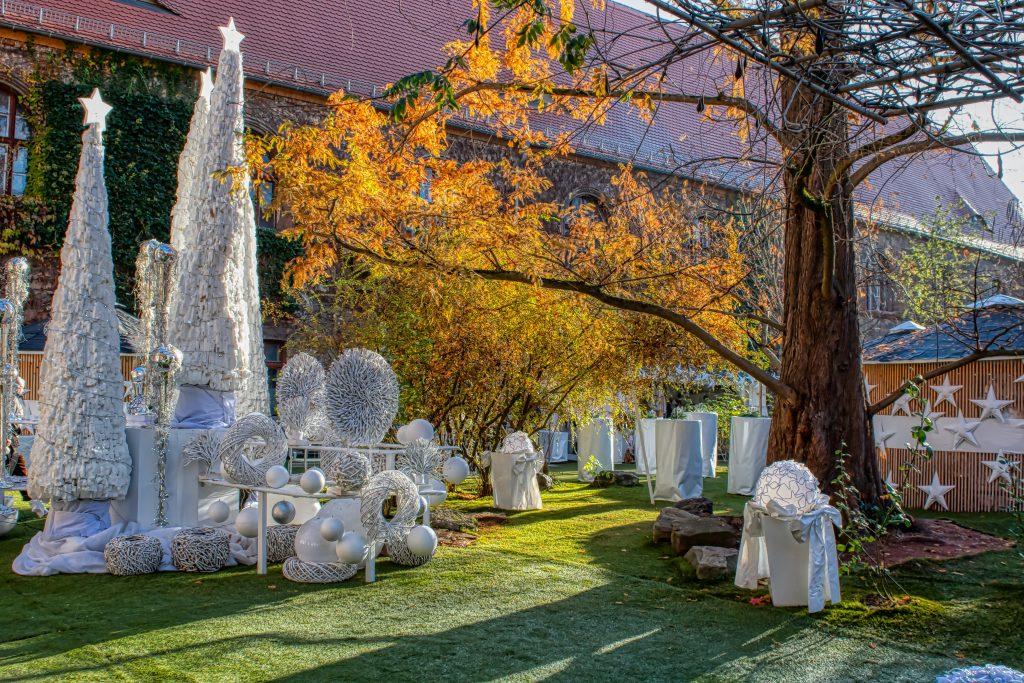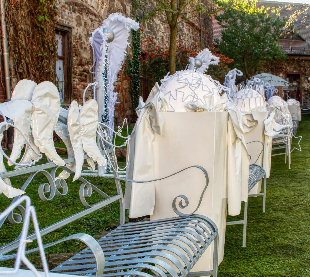 Für Langzeitarbeitslose zumindest vor und während der Ausstellung ist dies ein Segen, konnten sie doch 16 Pavillons gestalten mit dem Thema “Weihnachten”. Das gelang ihnen winterlich oder meisterhaft, je nach Sichtweise. Es gibt einen schönen Kontrast zwischen herbstlich verfärbten Bäumen, dem grünen Kunstrasen und den Winter/Weihnachtslandschaften in den Pavillons. Da kam viel zusammen und die Liebe zum Detail wurde sichtbar. Die Eisprinzessin hätte sich hier wohl gefühlt und ein wenig Eis und Schnee für den Boden gespendet. Schade, dass es Albrecht nicht sehen konnte, bei aller Kritik hatte er doch Sinn für Kunst. Öffentlich wäre es wohl unter seiner Herrschaft nicht geworden, aber die Zeiten ändern sich halt und nach fast 500 Jahren erst recht. Möge er in Frieden ruhen und unsereins konnte hier und da auf engelsgleichen Bänken ruhen. Das tat ich nun nicht, wusste ich doch nicht so recht, ob die Bank mit Flügel ein Gesamtkunstwerk war und wollte mich nicht als Kunstbanause outen. Wer das Genießen will, sollte es baldigst tun. Bis 20.12.2022 um genau zu sein.