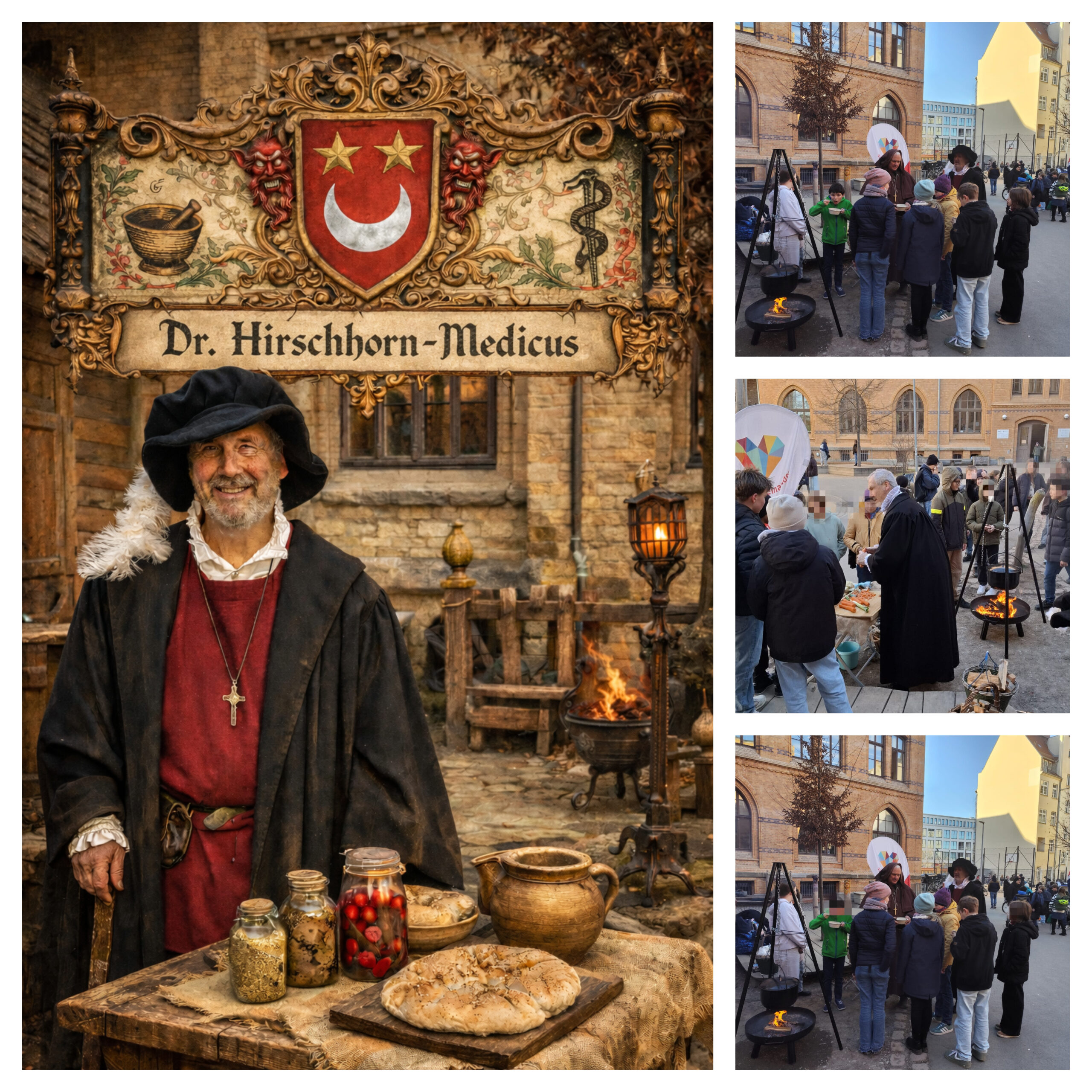Das Ganze mündet in diesem Jahr in ein Schaustück, über das noch zu berichten sein wird. An dem Tag stand das zweite Modul im Mittelpunkt. Natürlich wurde nicht einfach nur gekocht, sondern die Handlung einer abenteuerlichen Geschichte wurde eingebettet. Die Hauptrollen spielten Dr. Hirschhorn, ein Medicus aus Halle (an der Saale), und Hans von Waltheym, ein Wallfahrer und Pilger (1422–1479), die beide historische, verbürgte Persönlichkeiten waren. Der dritte im Bunde, Justus von Dölau, ein Händler, ist zwar fiktiv, rundet die Geschichte aber ab. Er begleitet die beiden in geheimer Mission, als Mönch verkleidet. Die Geschichte der drei wird zu einem späteren Zeitpunkt erzählt. So lernten die Kinder ganz nebenbei etwas über das Essen im Mittelalter, konnten probieren und den Geschichten lauschen. Den drei hanseatischen Figuren (Thoms Kirchhof als Dr. Hirschhorn und Initiator, Justus und Jürgen Seilkopf als getarnter Mönch und Hans Dieter Fechner als Dr. Waltheym) hat es ebenfalls gefallen, vor allem natürlich die nach mittelalterlichem Rezept gekochte Gulaschsuppe.