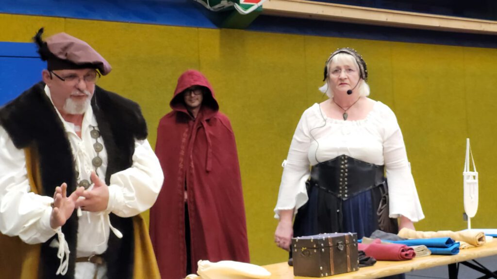 Schließlich folgte der Auftritt des Salzstadtclans e.V. Die beiden Schauspieler atmeten tief durch, denn sie mussten nicht, wie einst die Delegationen aus Lößnitz beim Salzfest, vor dem Spiel Quizfragen lösen. Sie zeigten in drei Episoden die Sprachgewandtheit und Bauernschläue einer Lößnitzerin, die irgendwann von Halle in die Stadt zog. Erasmus von Halberstadt, Salzgast aus dem 15. Jahrhundert, der sein Hallesches Salz auf der Salzstraße nach Prag auch nach Lößnitz brachte und anpries, unterschätzte wohl „das winzige Dorf mit der unverständlichen Sprache“ und nahm sich vor, die Leute übers Ohr zu hauen. Aber er wurde selbst über den Tisch gezogen. Der Bürgermeister der Stadt Lößnitz, Alexander Troll, spielte in dem Stück eine Hauptrolle und gab vor über 600 Jahren den Bürgermeister (was sonst). Er kommentierte die Szene später mit den Worten: „Das kommt nicht oft vor, dass ich nur in der Ecke stehen muss und nichts zu sagen habe“. Die Pointe der Episode war aber auf jeden Fall er. Zum Dank erhielt er einen von der Kasseler Künstlerin Beatrix Thieme vom Salzstadtclan e.V. gezeichneten Kalender.