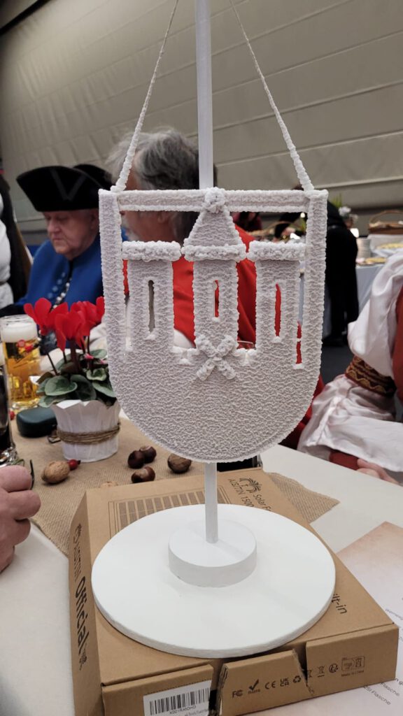 Zum Salzmarkt tritt die Stadtverwaltung in geschlossener Tracht auf und gibt zumindest an diesem Tag ein geschlossenes und zufriedenes Bild ab. Bürgermeister Troll durfte sich auch über das Wappen seiner Stadt freuen, das nach alter Tradition komplett mit Salz überzogen war und von den anwesenden Mitgliedern des Salzstraßenvereins überreicht wurde.