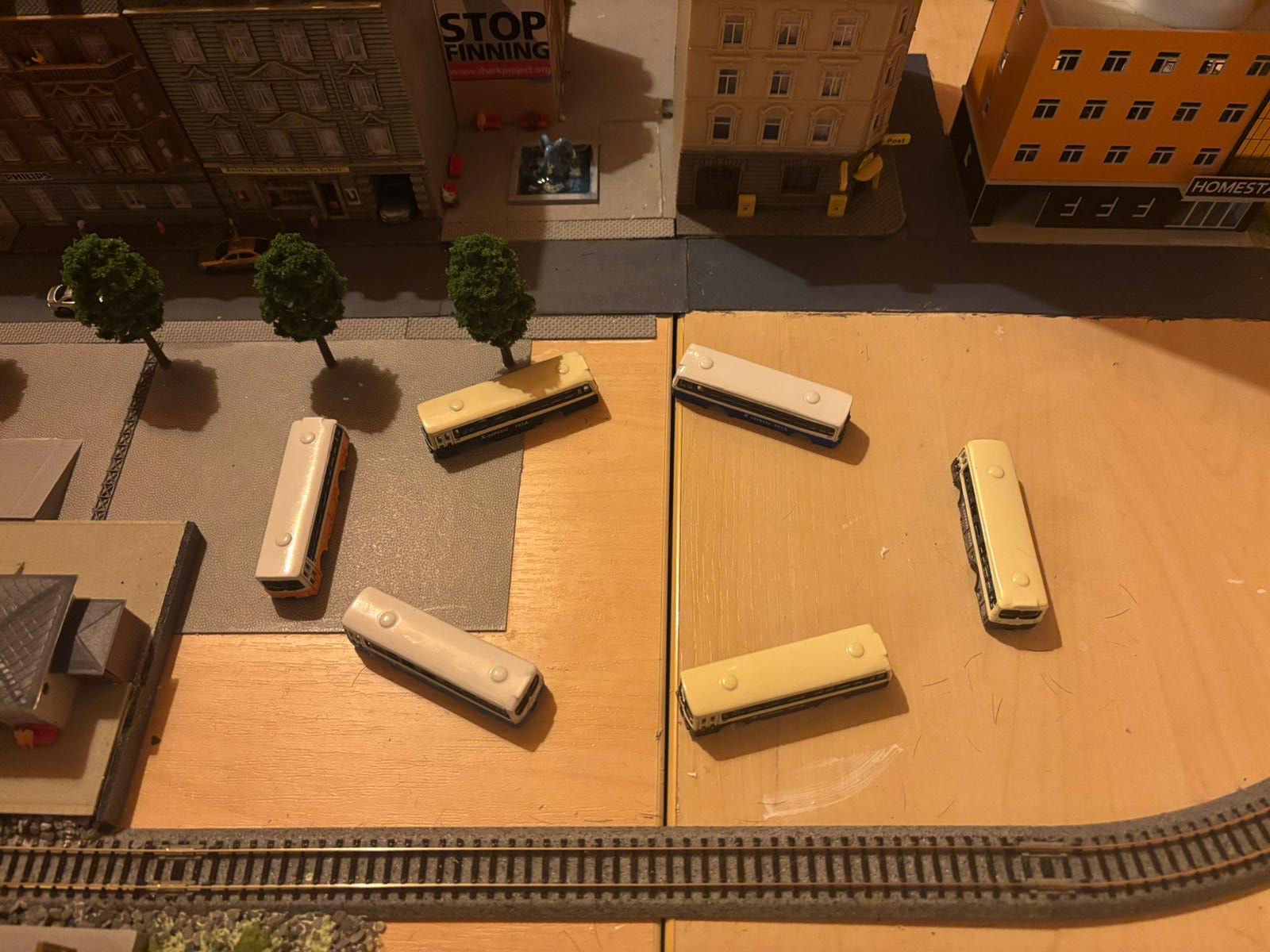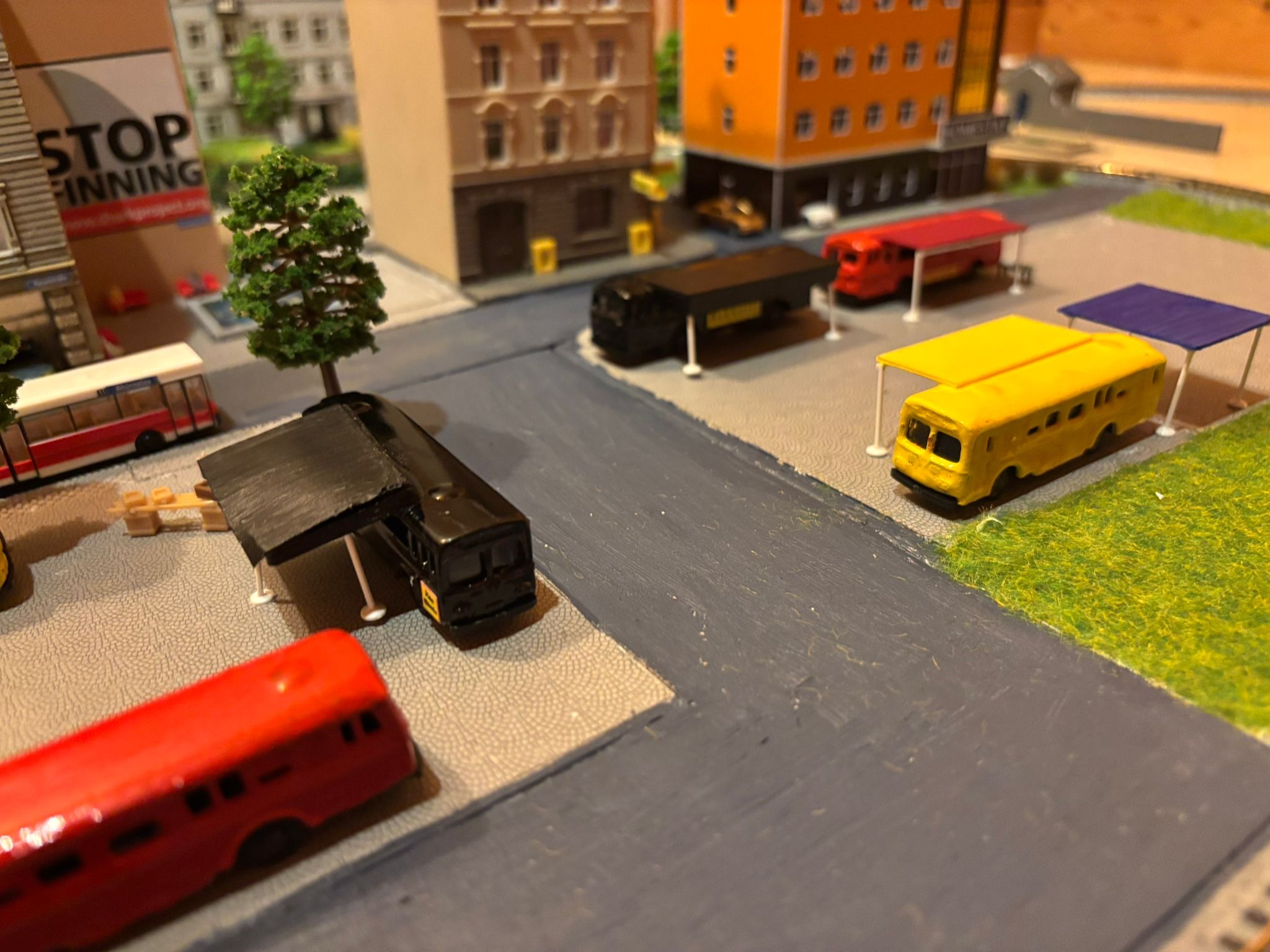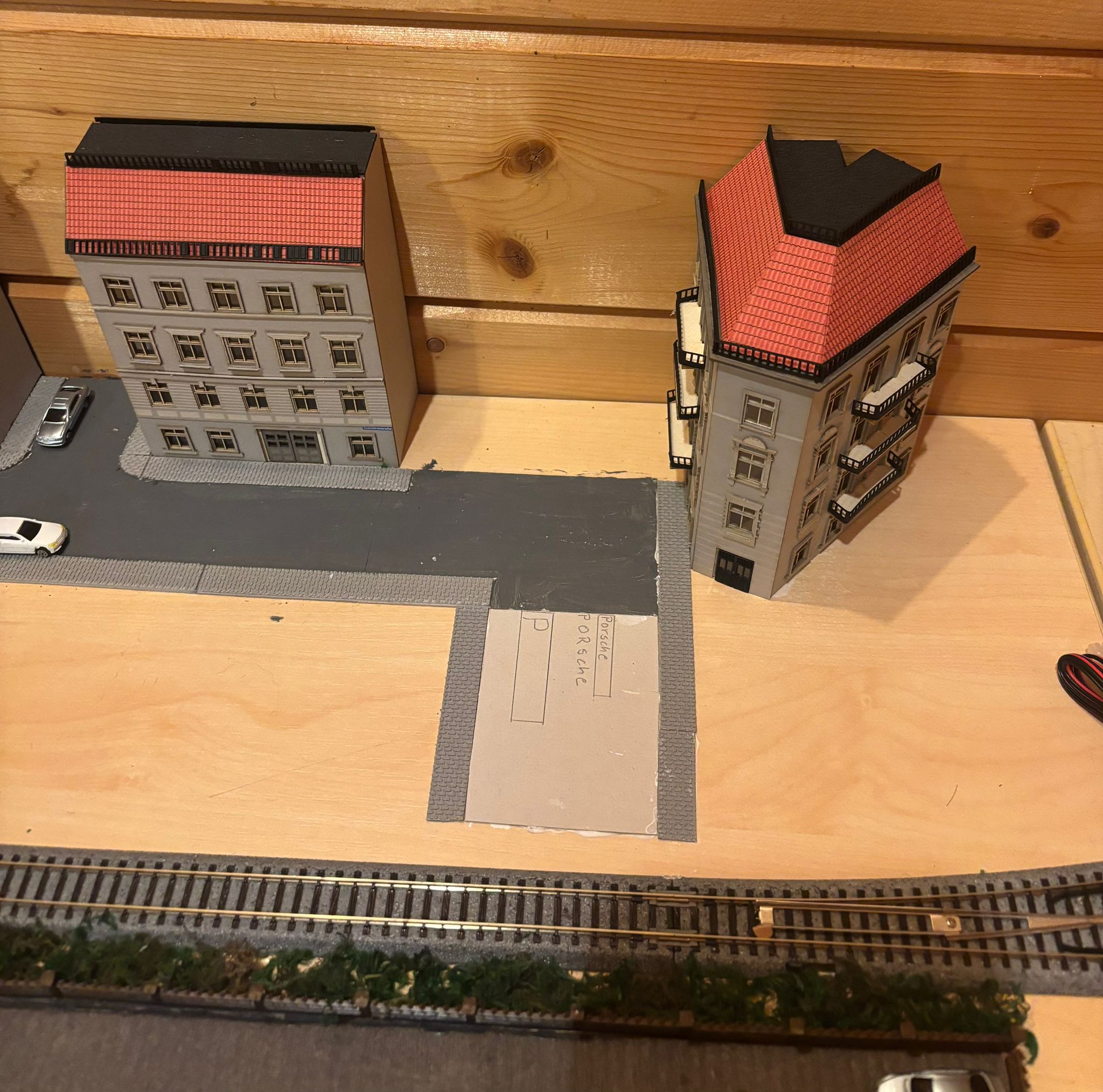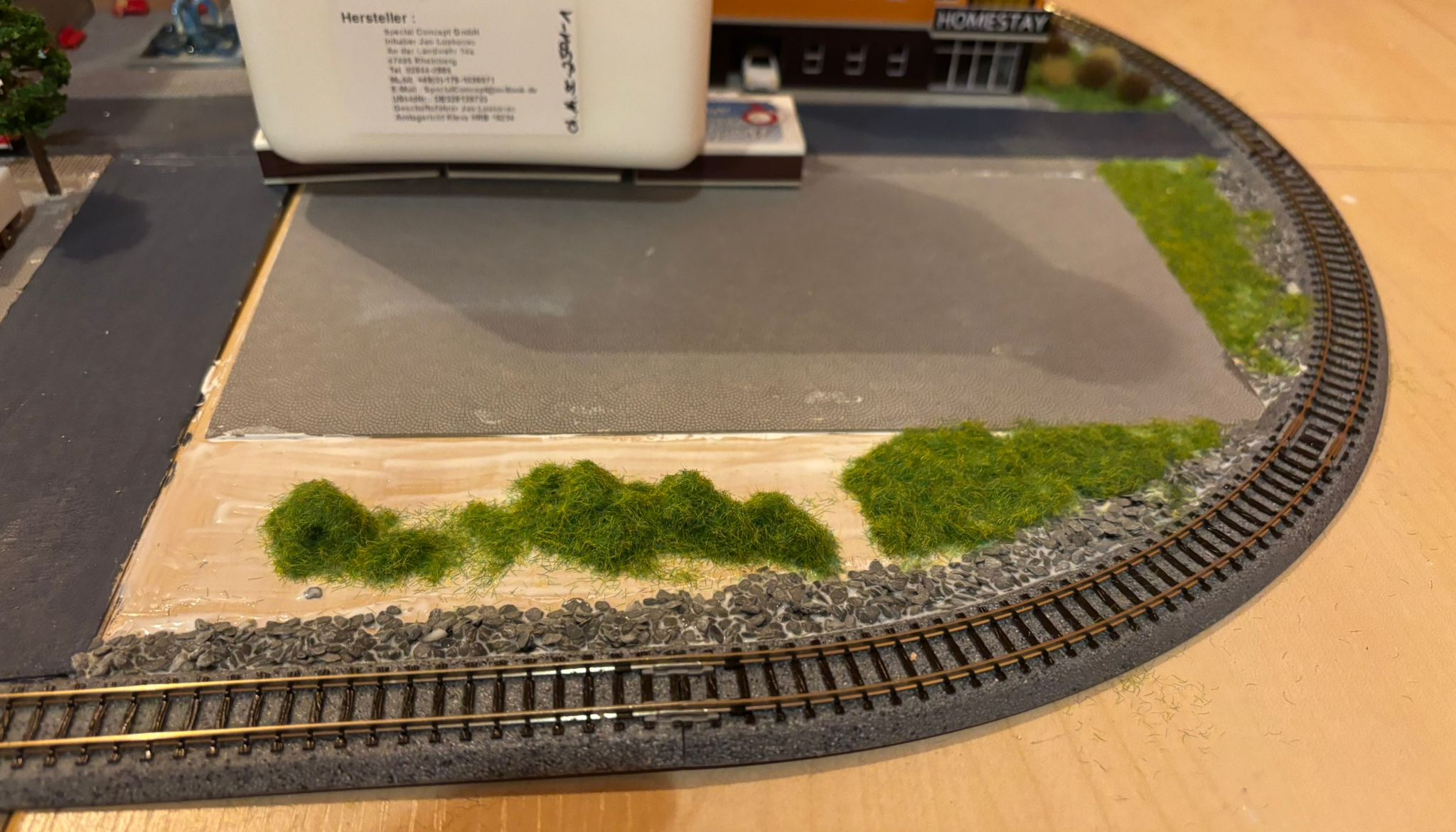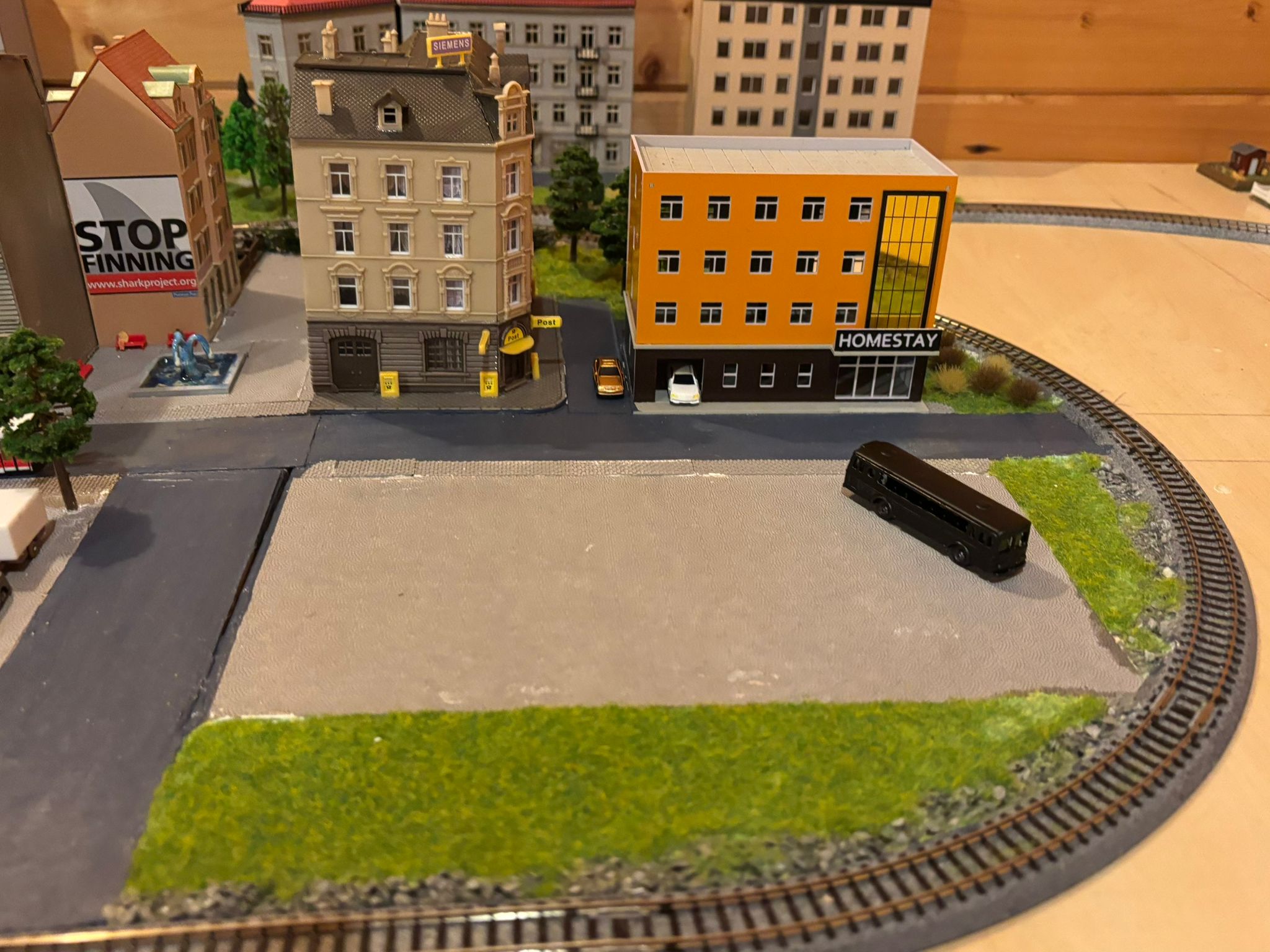Die Gleise bekommen ihr typisches Schotterbett, das eingeklebt wird. Interessant wird der Platz vor den Wohnblöcken. Da steht ein ungebauter, neu lackierter Bus. Fünf Busse sid in Arbeit. Daraus baut der Tüftler einen Festivalbuskreis. Man darf aufs Ergebnis gespannt sein.