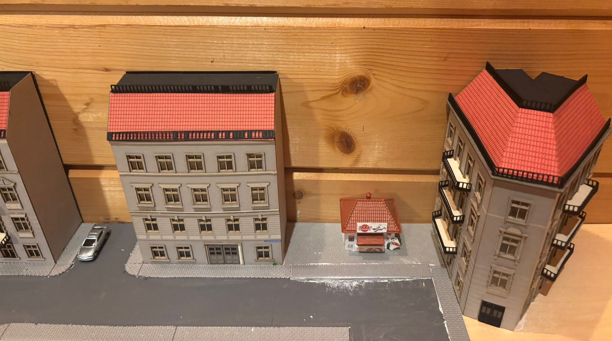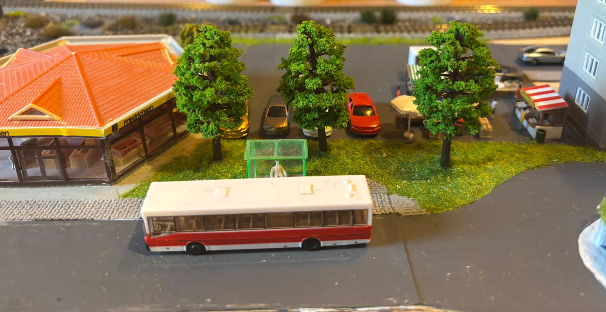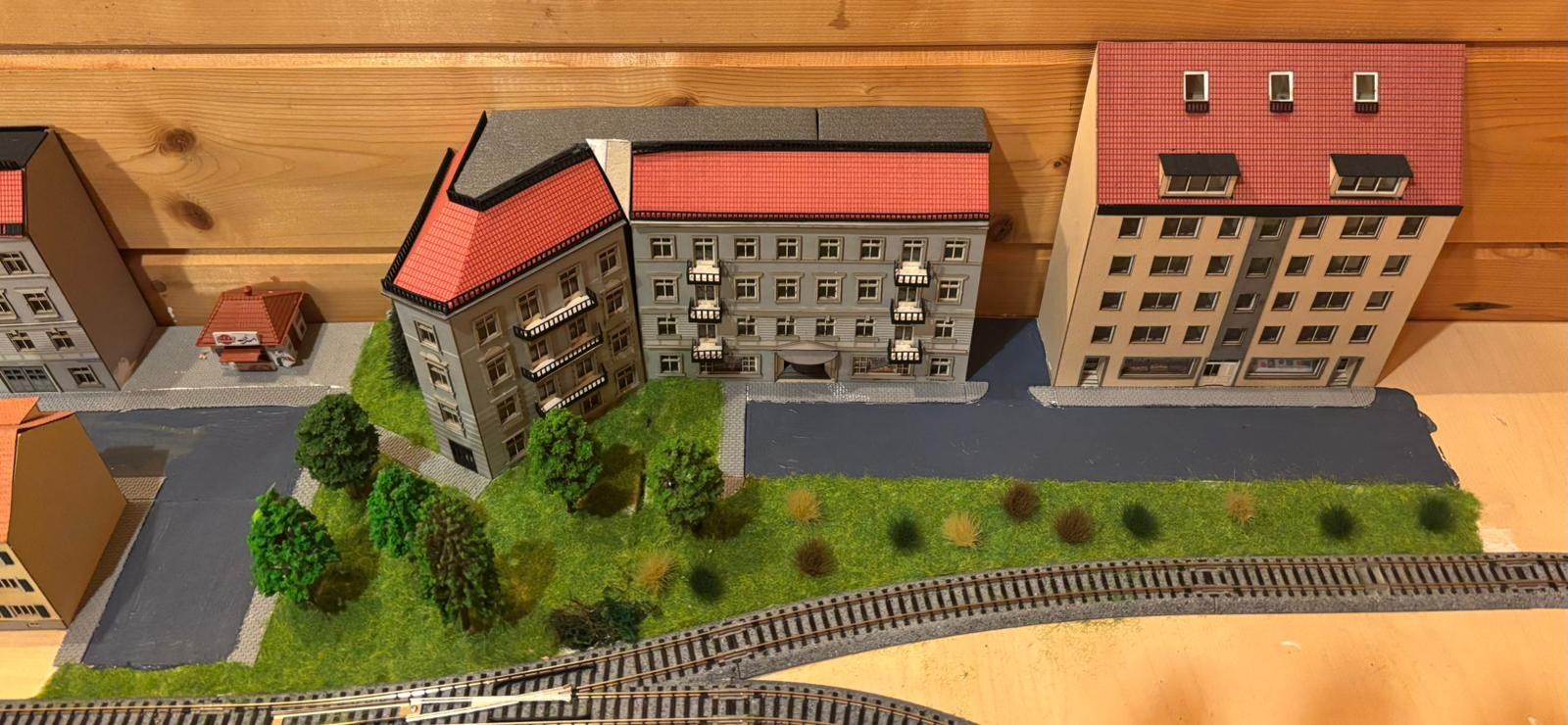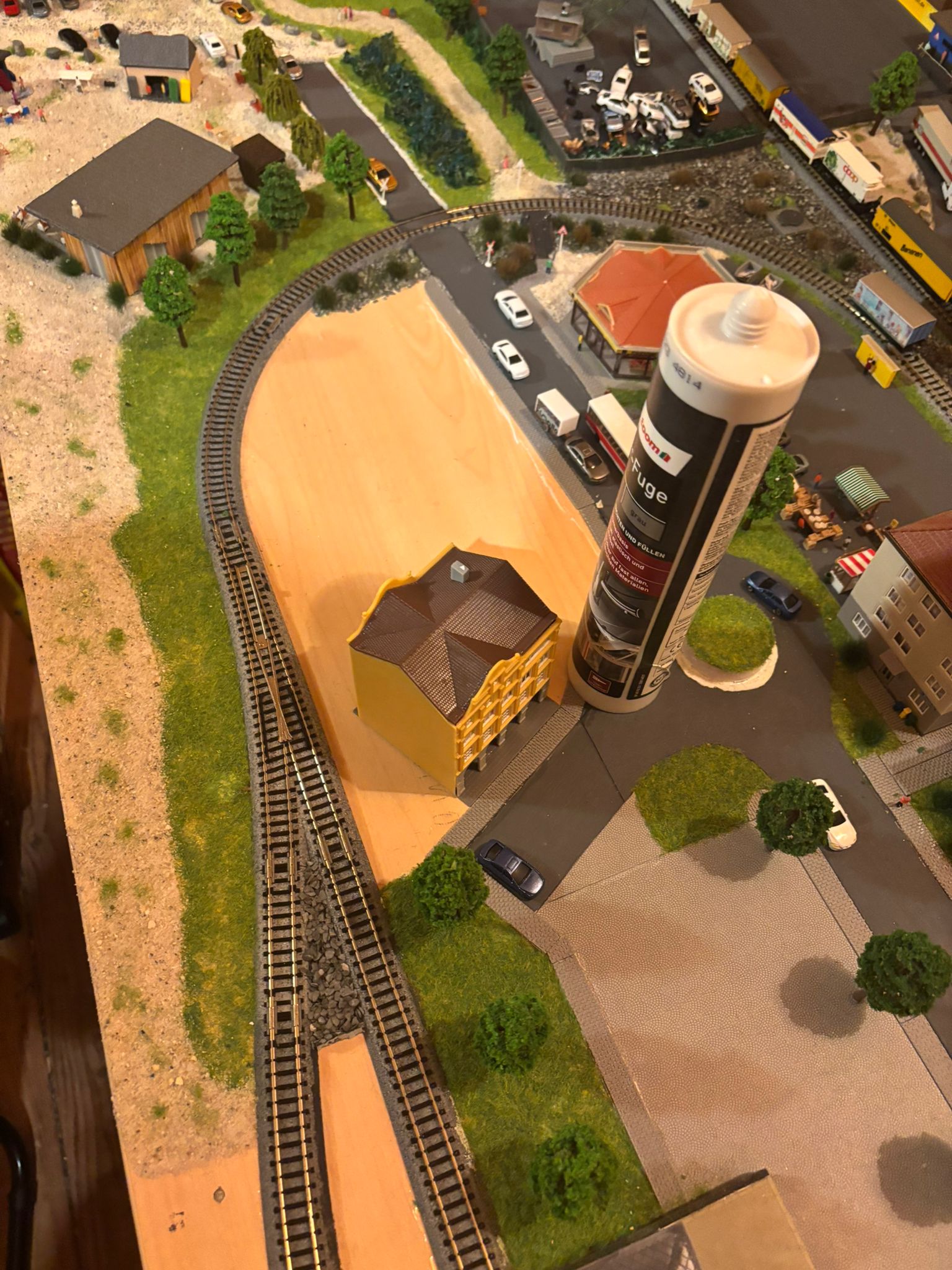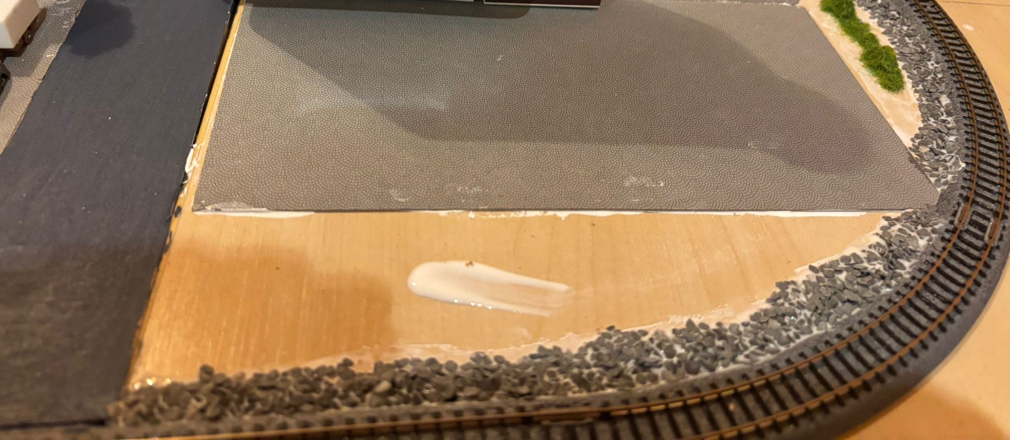 Die Gleise bekommen ihr typisches Schotterbett, das eingeklebt wird. Interessant wird der Platz vor den Wohnblöcken. Da steht ein ungebauter, neu lackierter Bus. Fünf Busse sid in Arbeit. Daraus baut der Tüftler einen Festivalbuskreis. Man darf aufs Ergebnis gespannt sein.