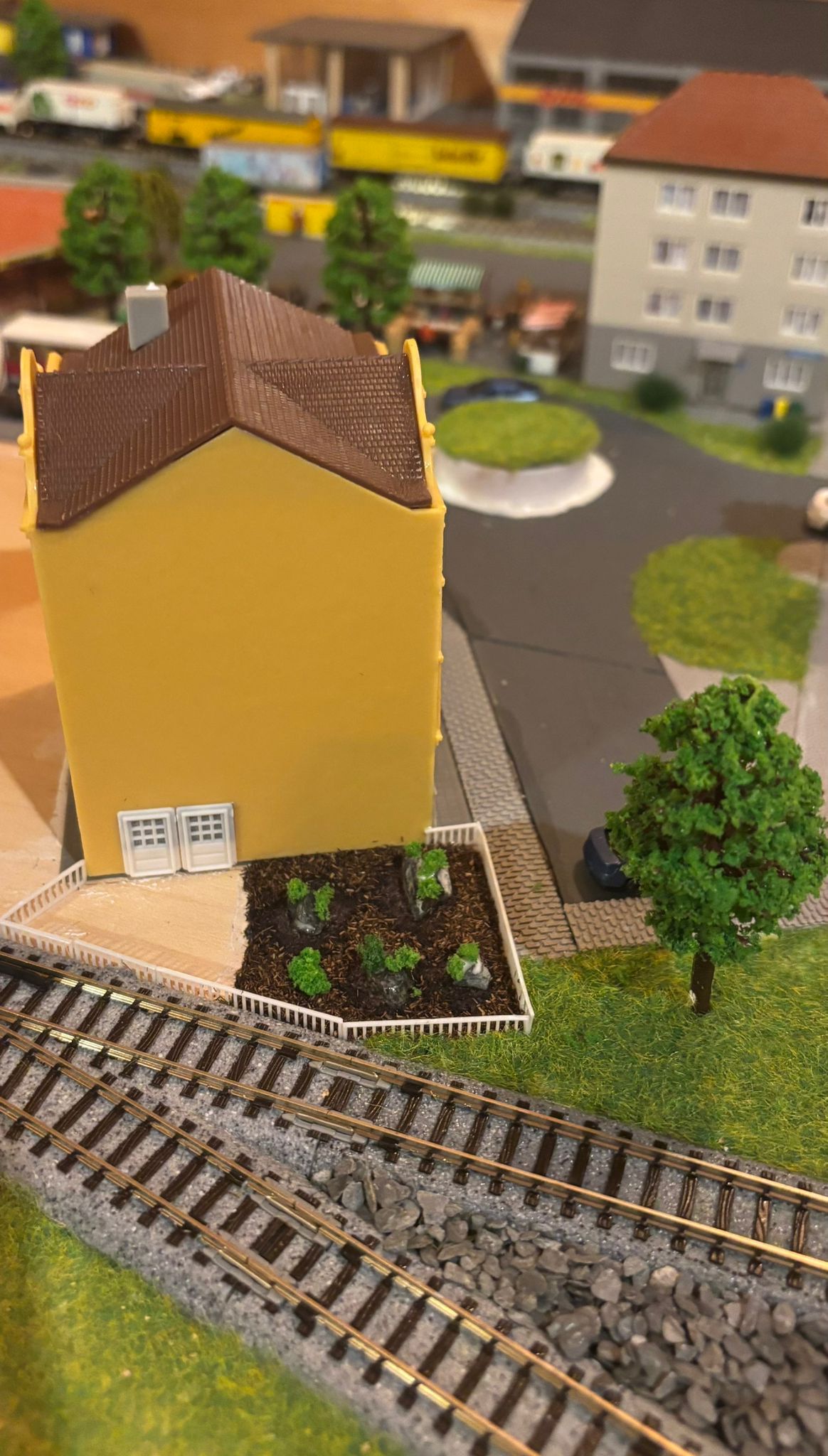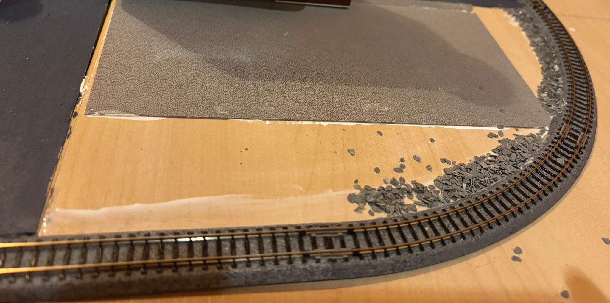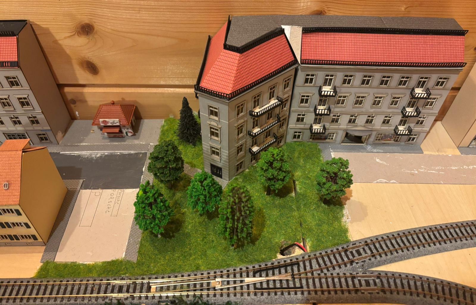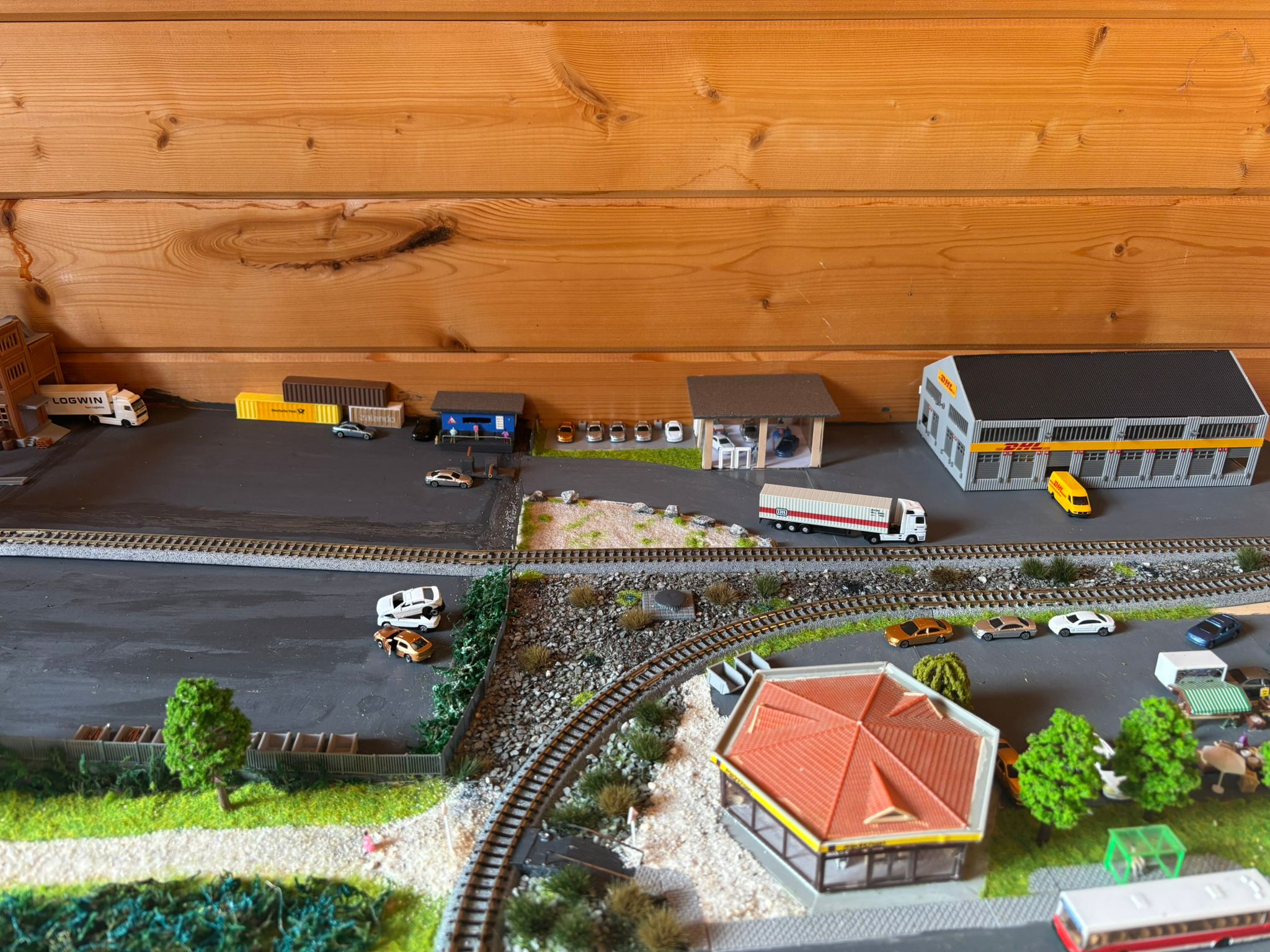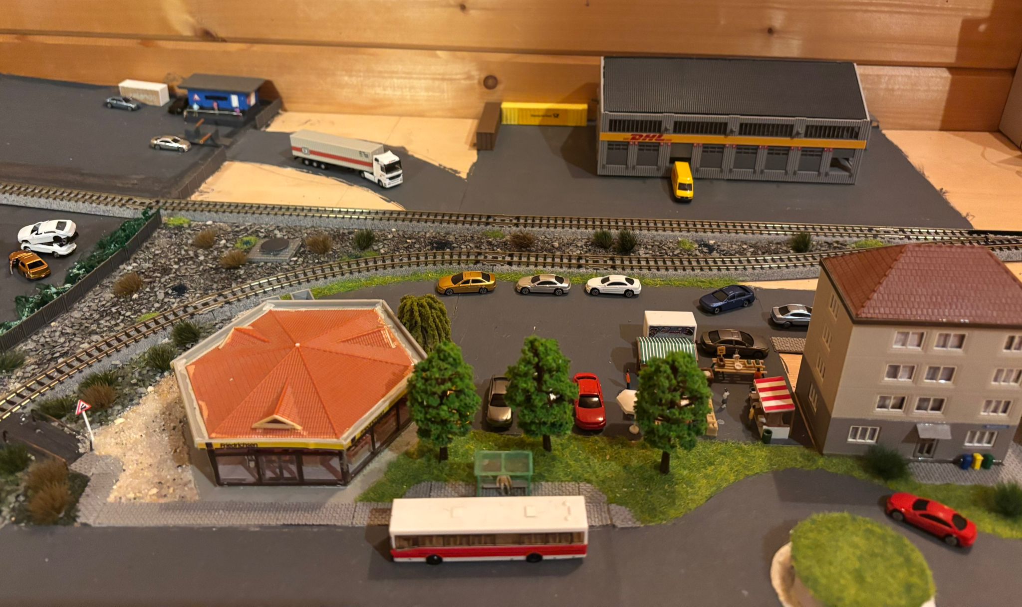 Die Gleise bekommen ihr typisches Schotterbett, das eingeklebt wird. Interessant wird der Platz vor den Wohnblöcken. Da steht ein ungebauter, neu lackierter Bus. Fünf Busse sid in Arbeit. Daraus baut der Tüftler einen Festivalbuskreis. Man darf aufs Ergebnis gespannt sein.