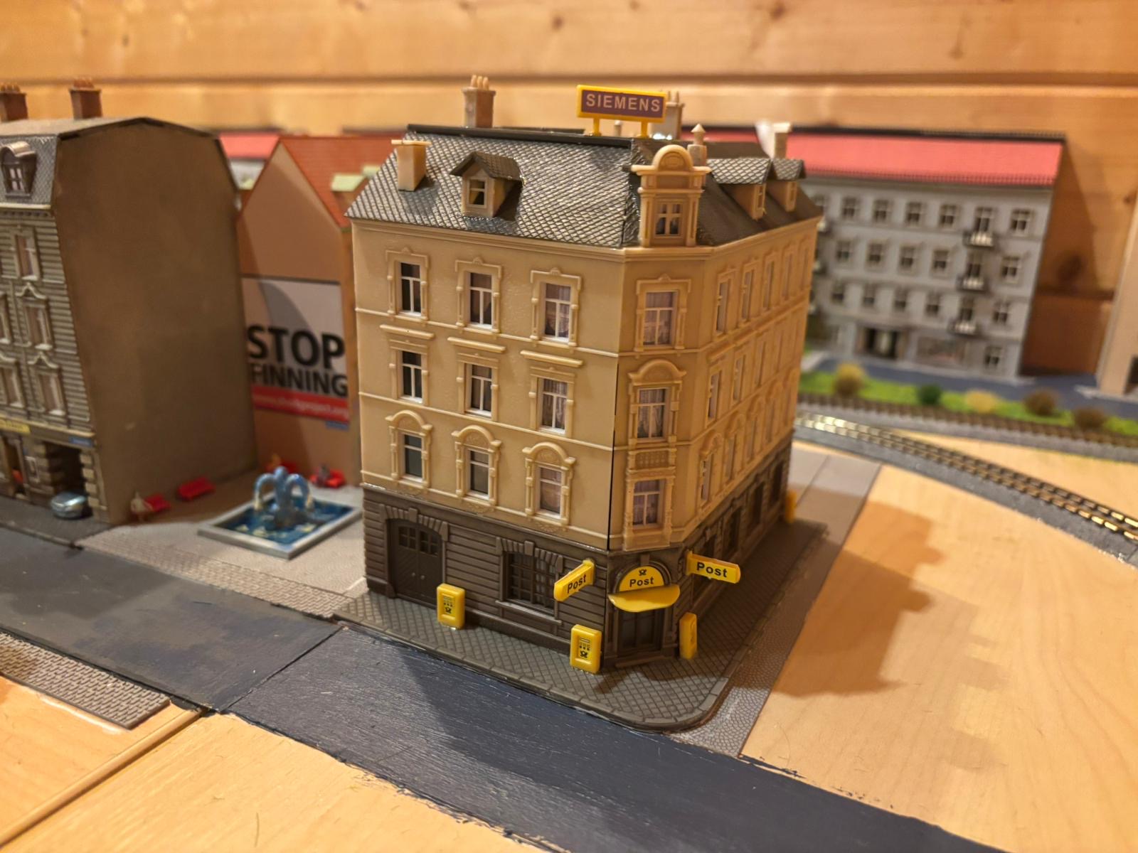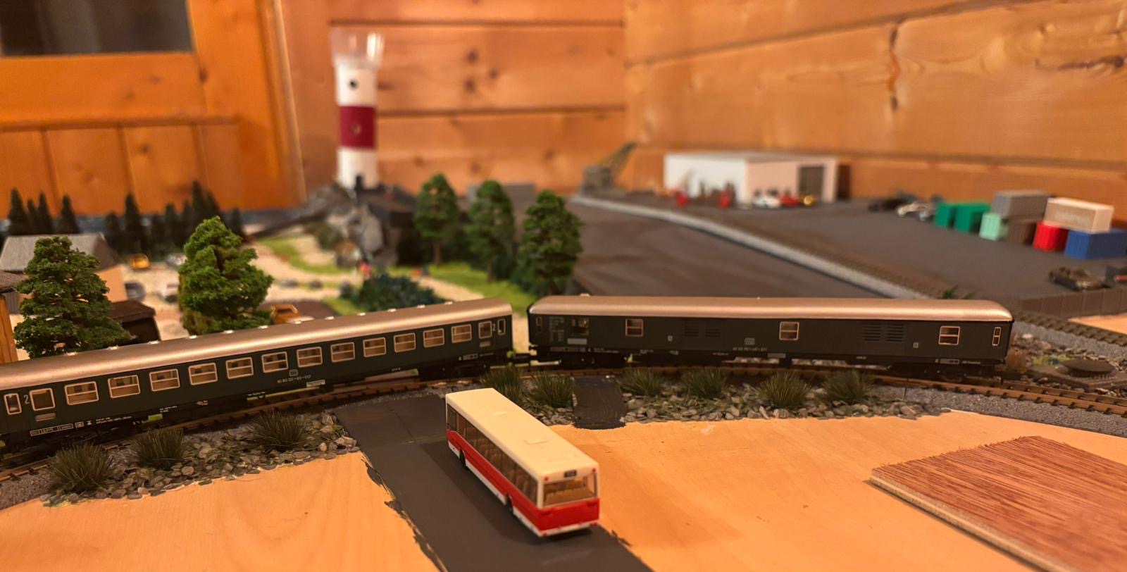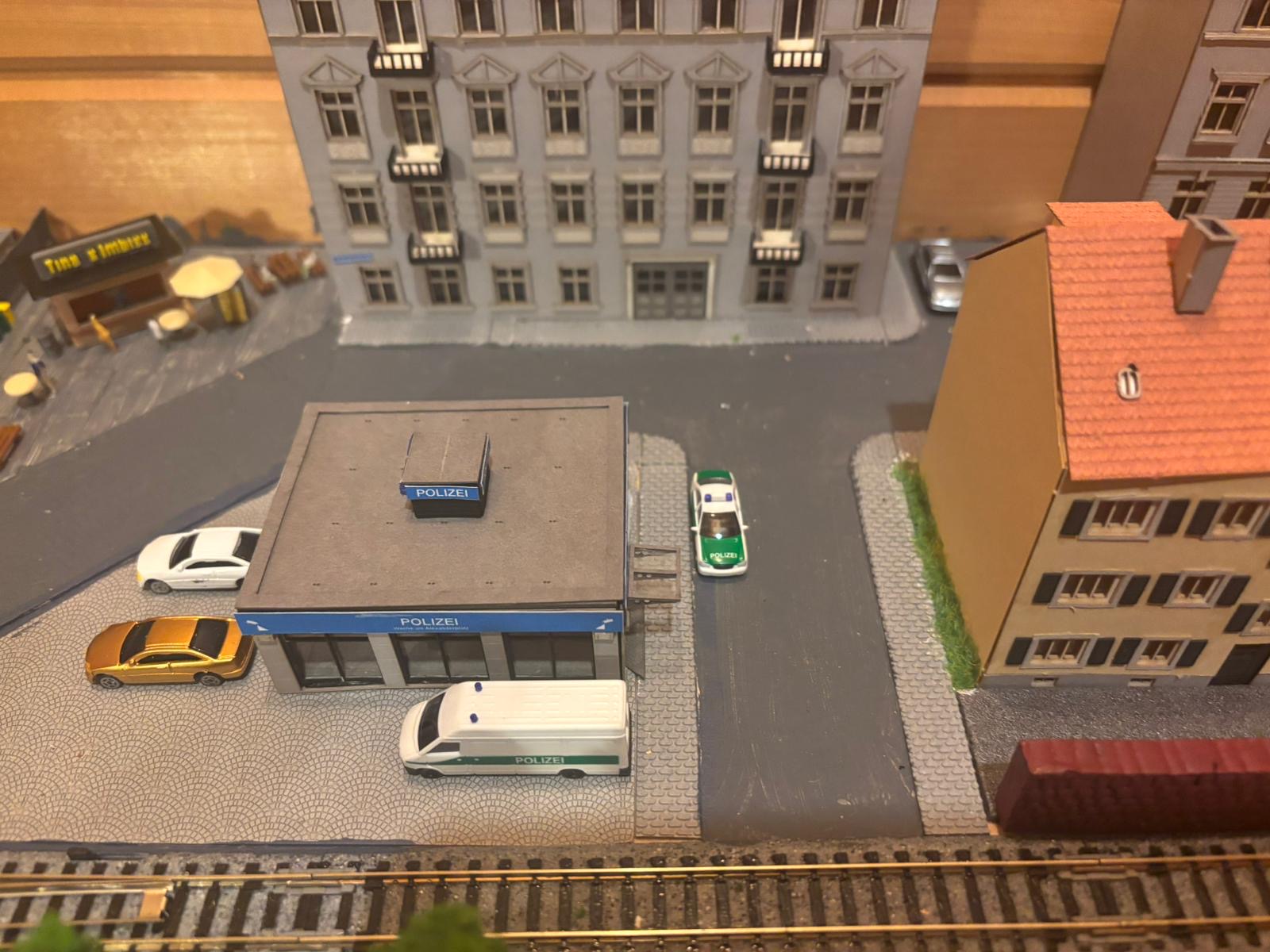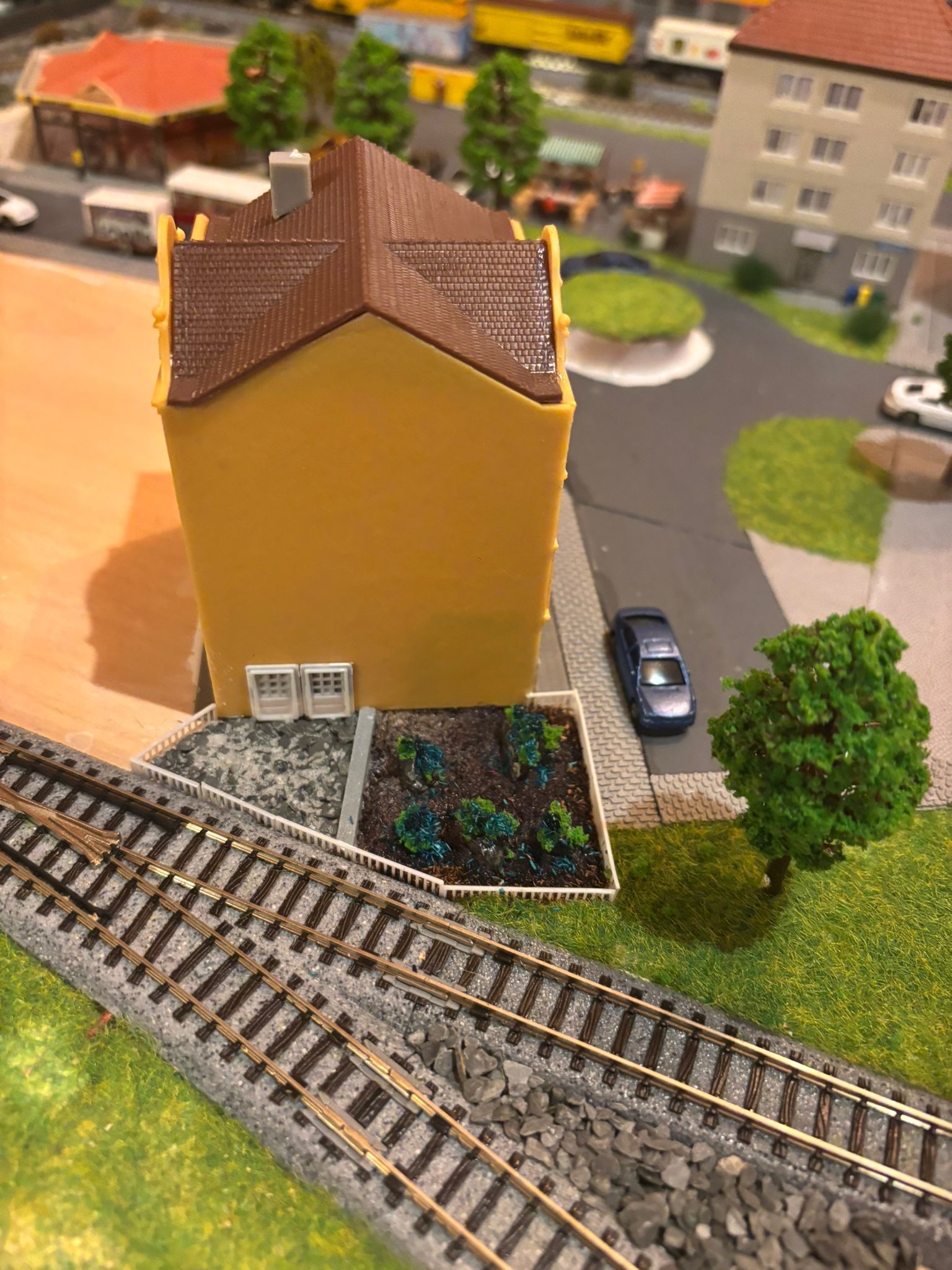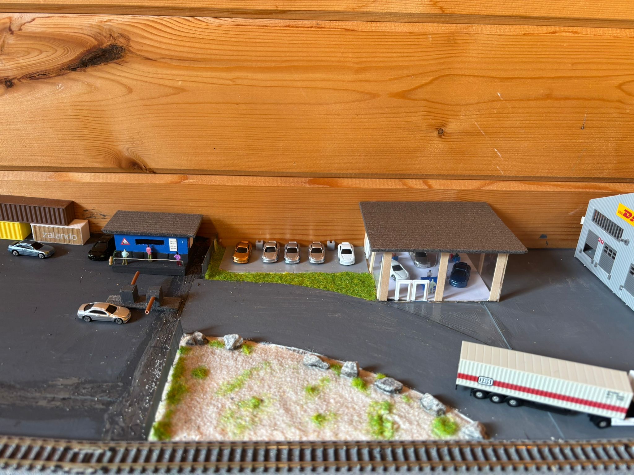 Die Gleise bekommen ihr typisches Schotterbett, das eingeklebt wird. Interessant wird der Platz vor den Wohnblöcken. Da steht ein ungebauter, neu lackierter Bus. Fünf Busse sid in Arbeit. Daraus baut der Tüftler einen Festivalbuskreis. Man darf aufs Ergebnis gespannt sein.