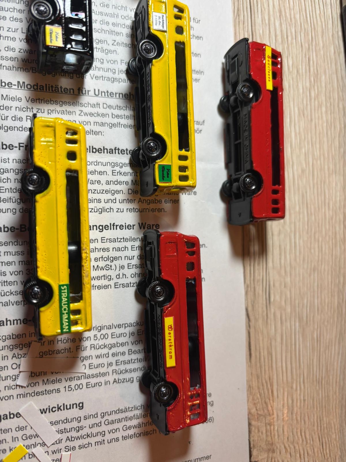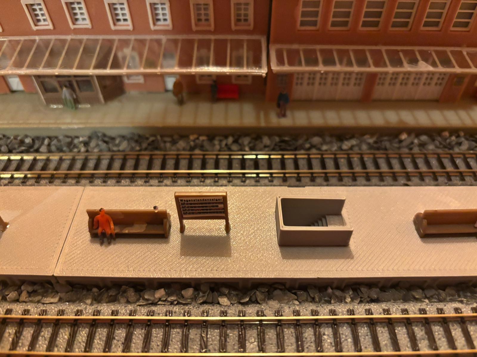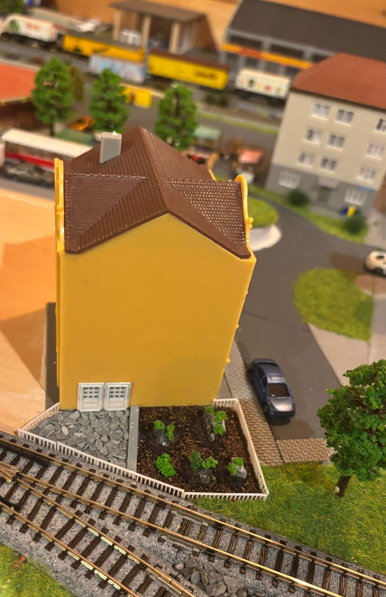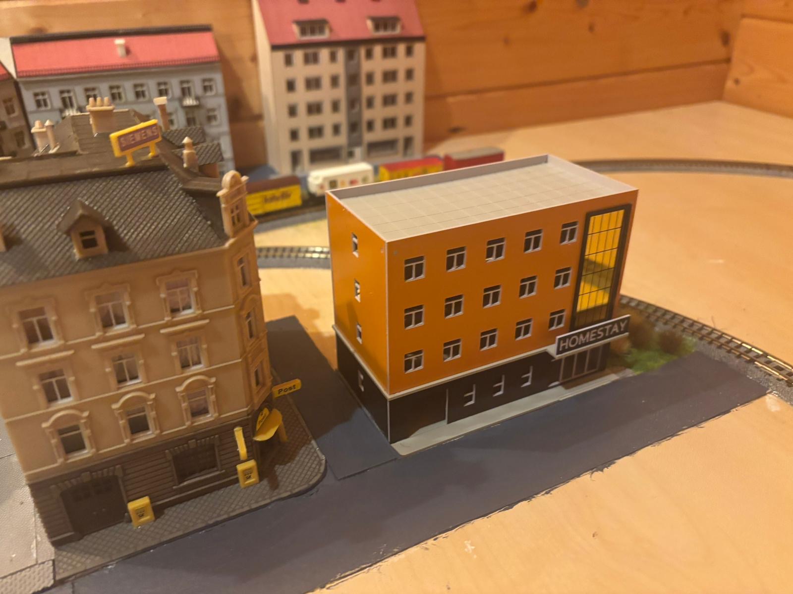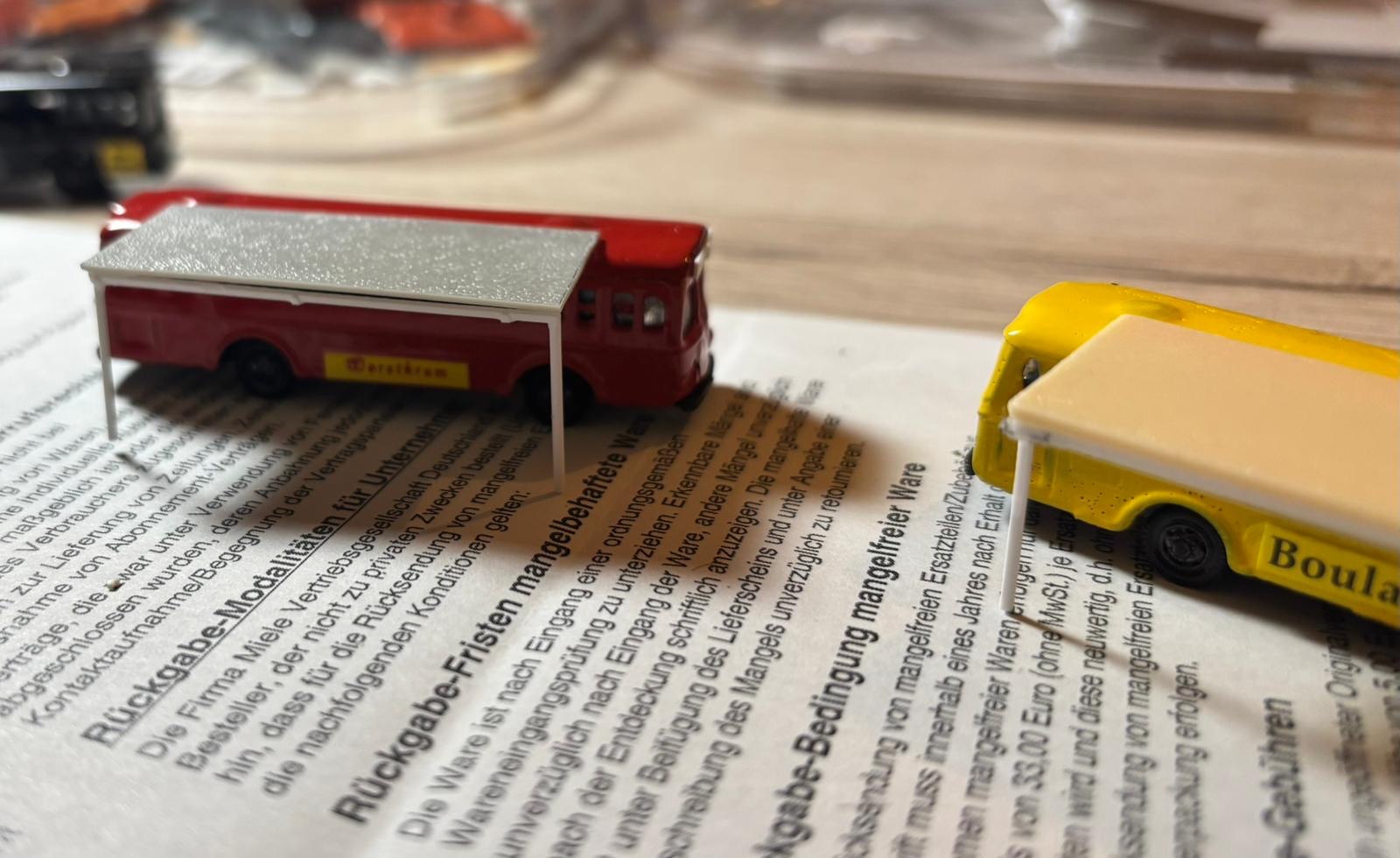 Die Gleise bekommen ihr typisches Schotterbett, das eingeklebt wird. Interessant wird der Platz vor den Wohnblöcken. Da steht ein ungebauter, neu lackierter Bus. Fünf Busse sid in Arbeit. Daraus baut der Tüftler einen Festivalbuskreis. Man darf aufs Ergebnis gespannt sein.