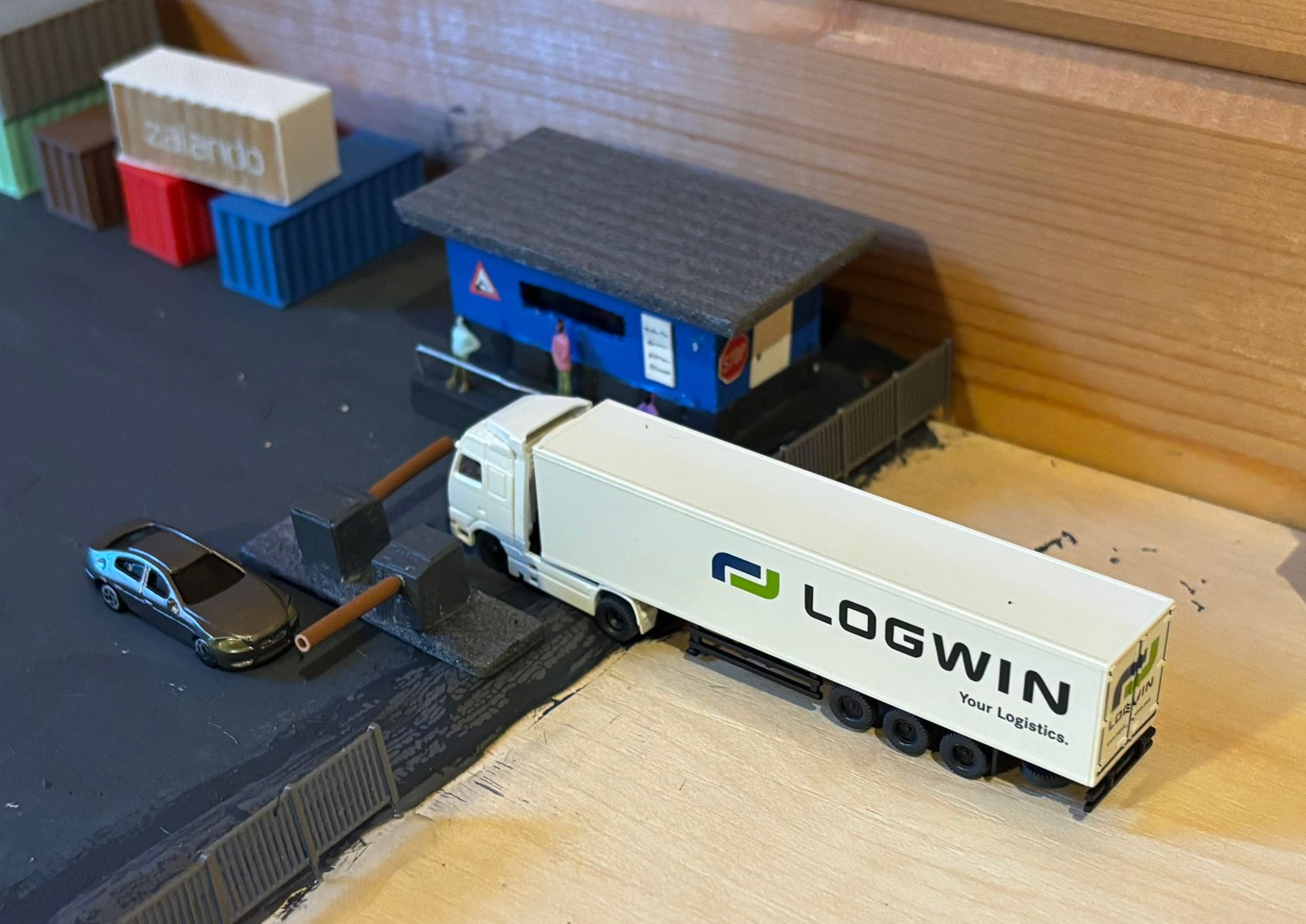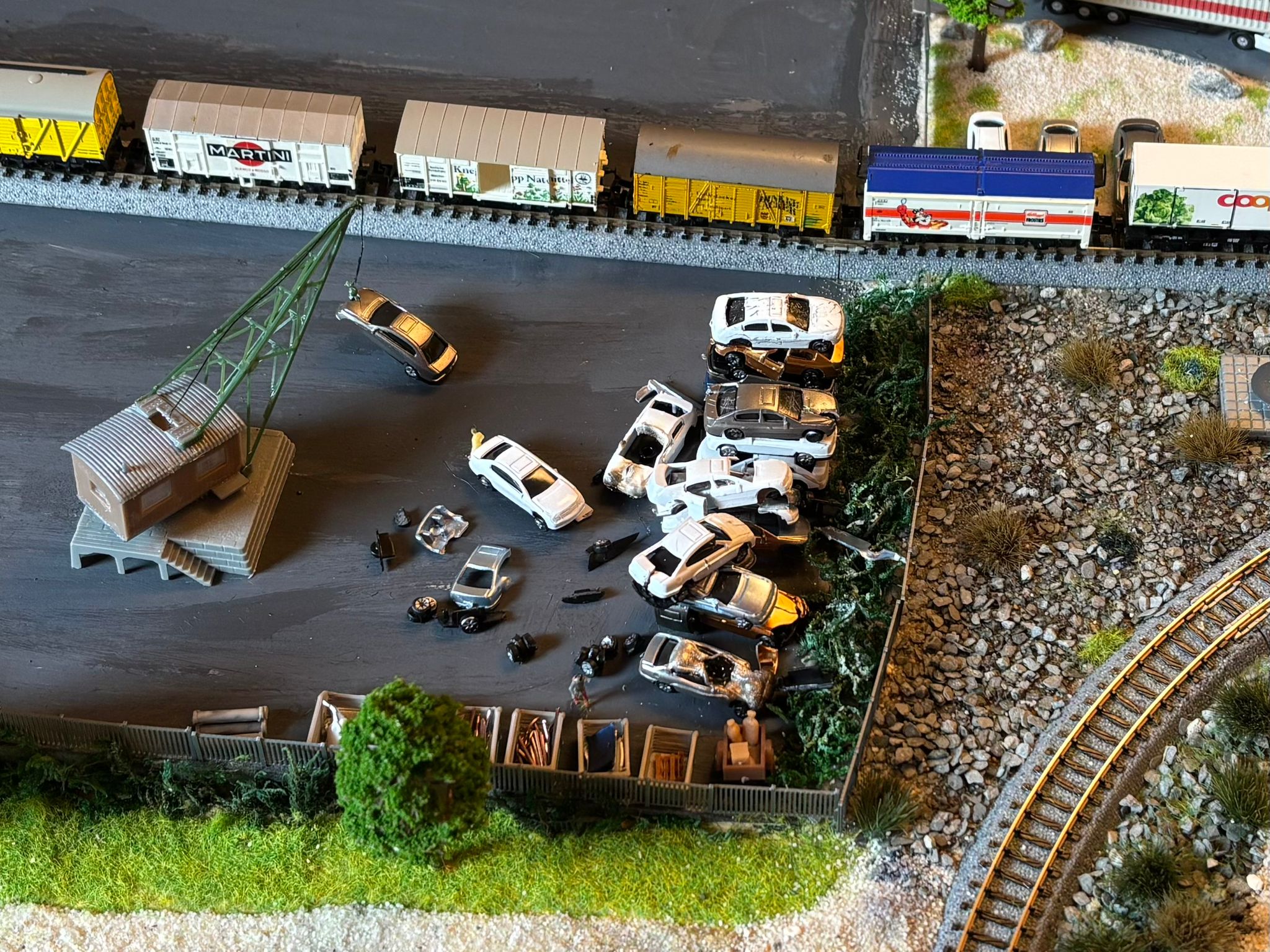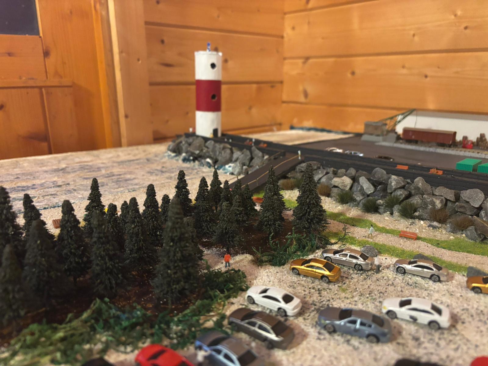 Eine Stadt entsteht am Hafen.. Dabei setzt Christian auf eigens gebaute Modelle, wie zum Beispiel einen Brunnen, Carport und Pfördner an der Schranke. Das macht die Anlage individueller. Besonders gelungen sind der Schrottplatz und die Mole. Der Strand lädt zum Baden ein.