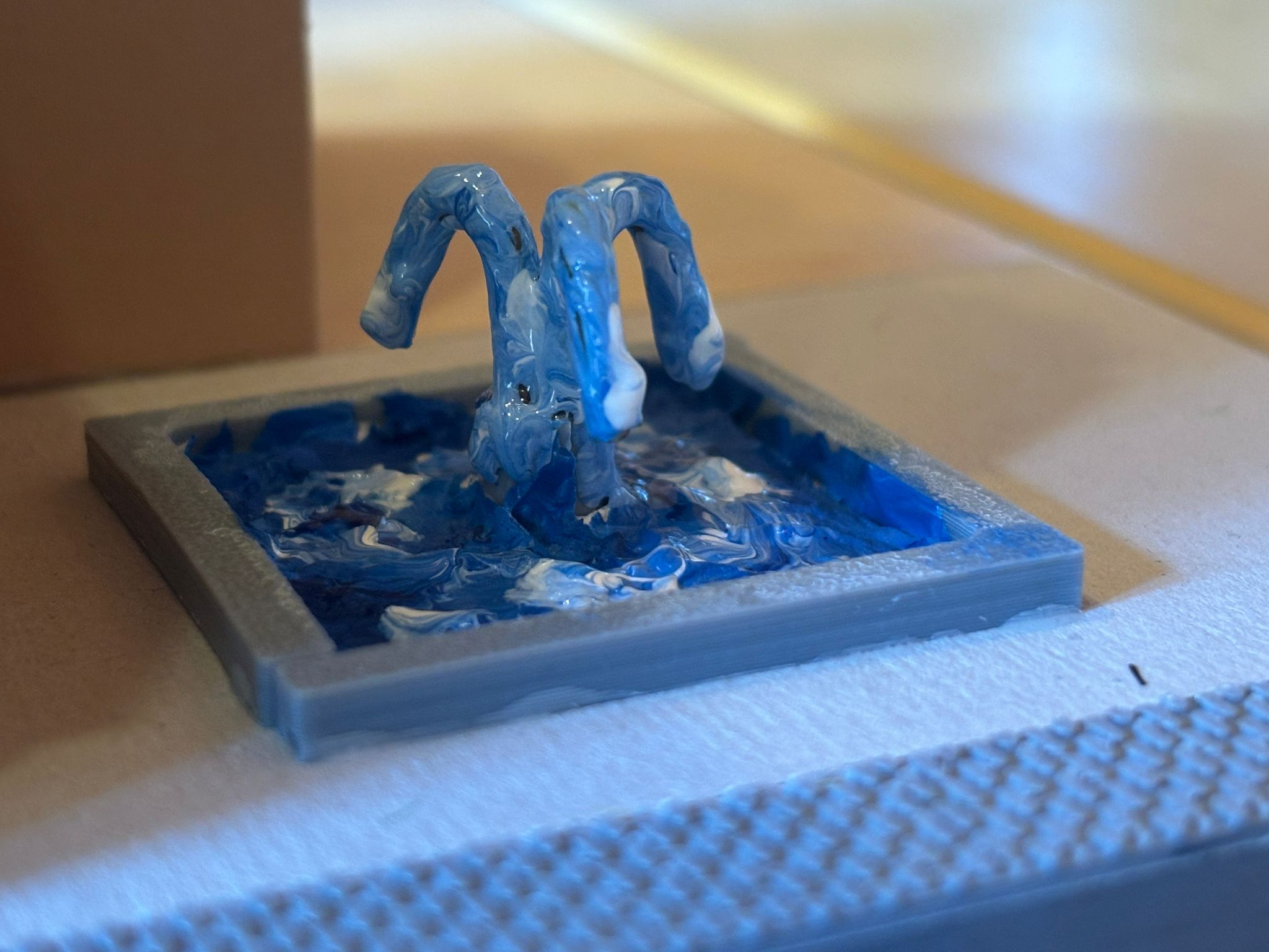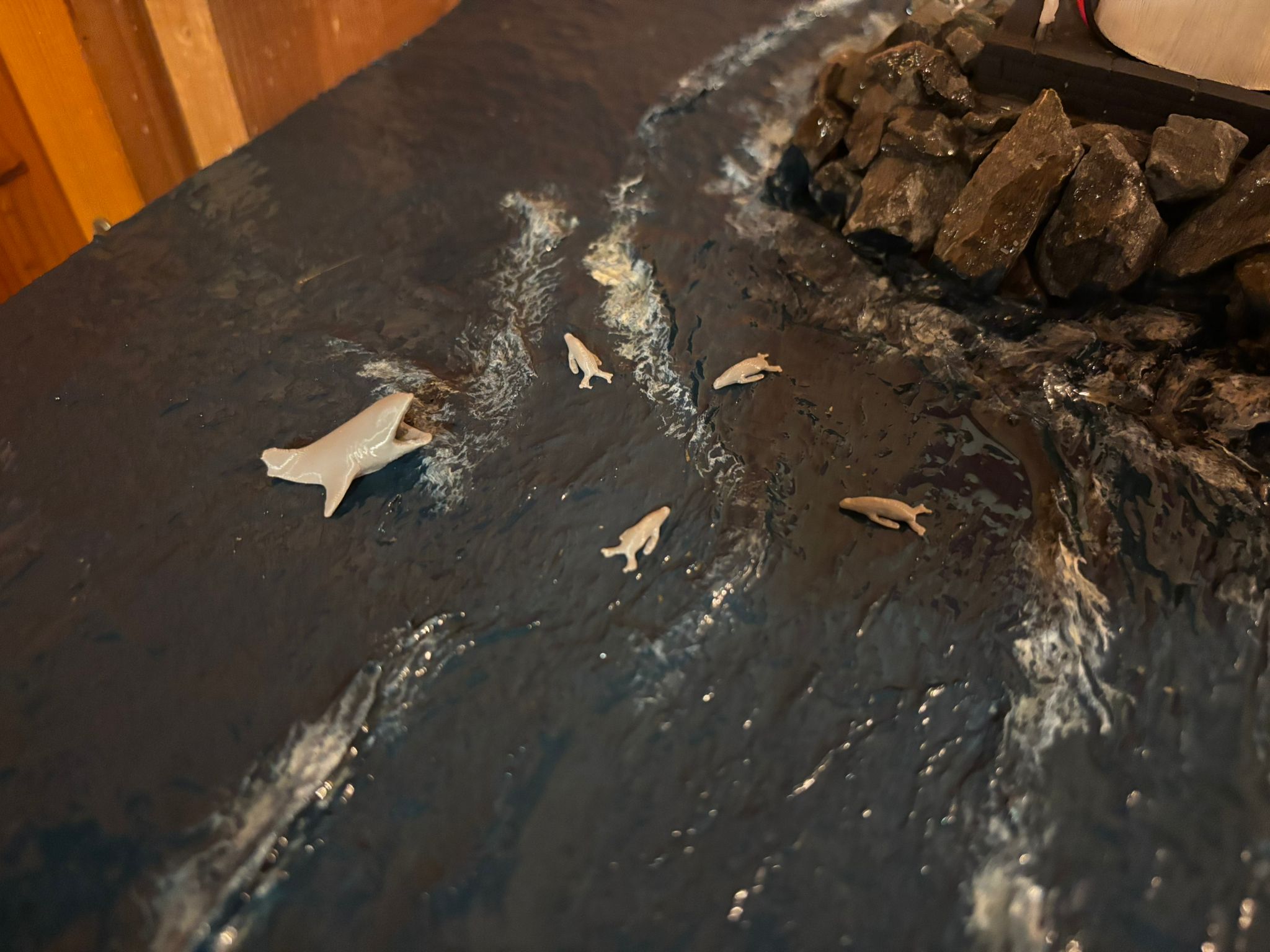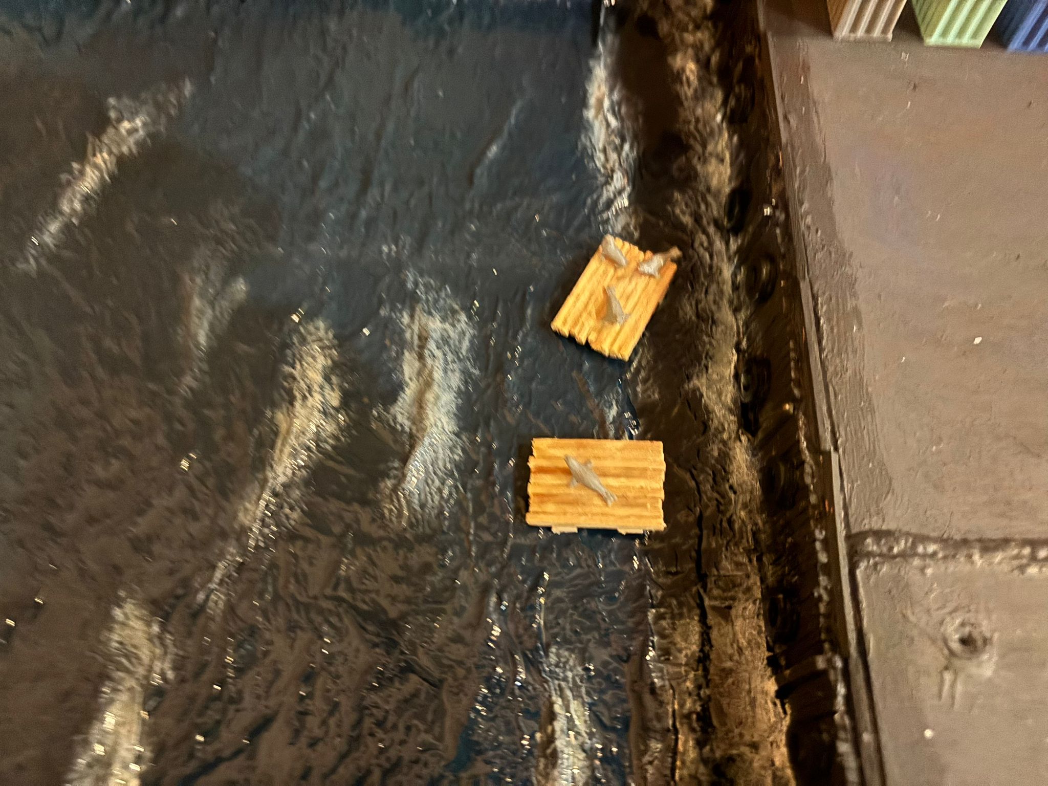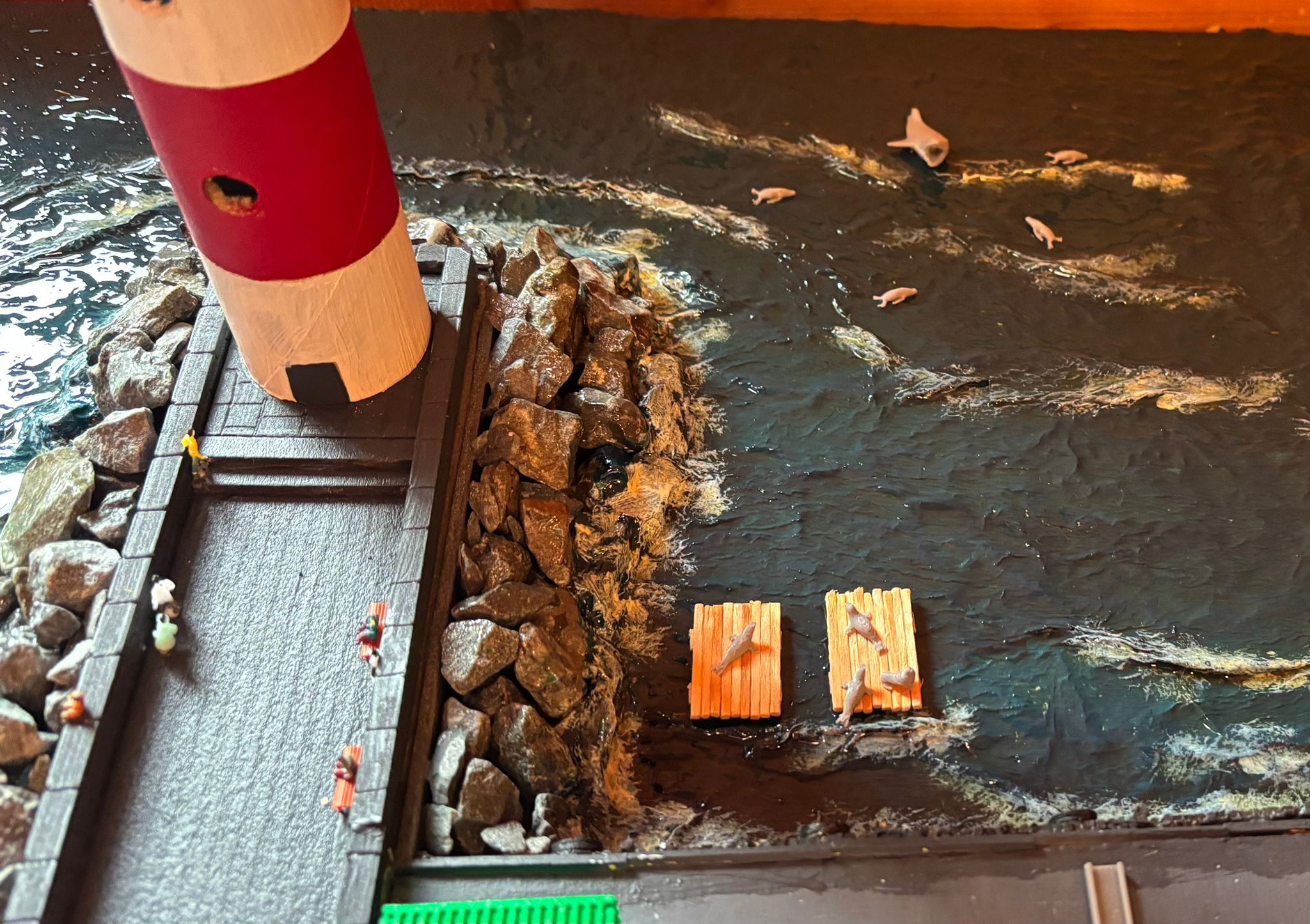 Christian gestaltet seinen geliebten Hafen weiter. Als Gag und Reminiszenz hat er den weißen Hai gleich eingebaut. Dabei dachte er aber auch an die flüchtenden Menschen und spendierte er ihnen gleich mal zwei Flöße. Ob die helfen sei mal dahingestellt, aber der Gedanke ist da. Sein Gewässer macht ebenfalls ganz schön Wellen.