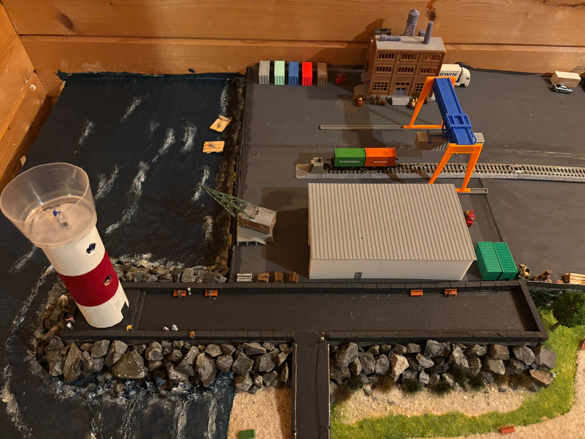 Eine Mole ist am Entstehen. Das Bild im Kopf Christians formt sich für die Anlage. Bis Züge und/oder Sattelschlepper sich einfinden, dauert es aber noch. Mit Akribie und Einfallsreichtum modelliert Christian Wasser aus Klopapier. Seine Mole gedeiht weiter und bald werden erste Bevölkerungsschichten die Landschaft in Besitz nehmen.