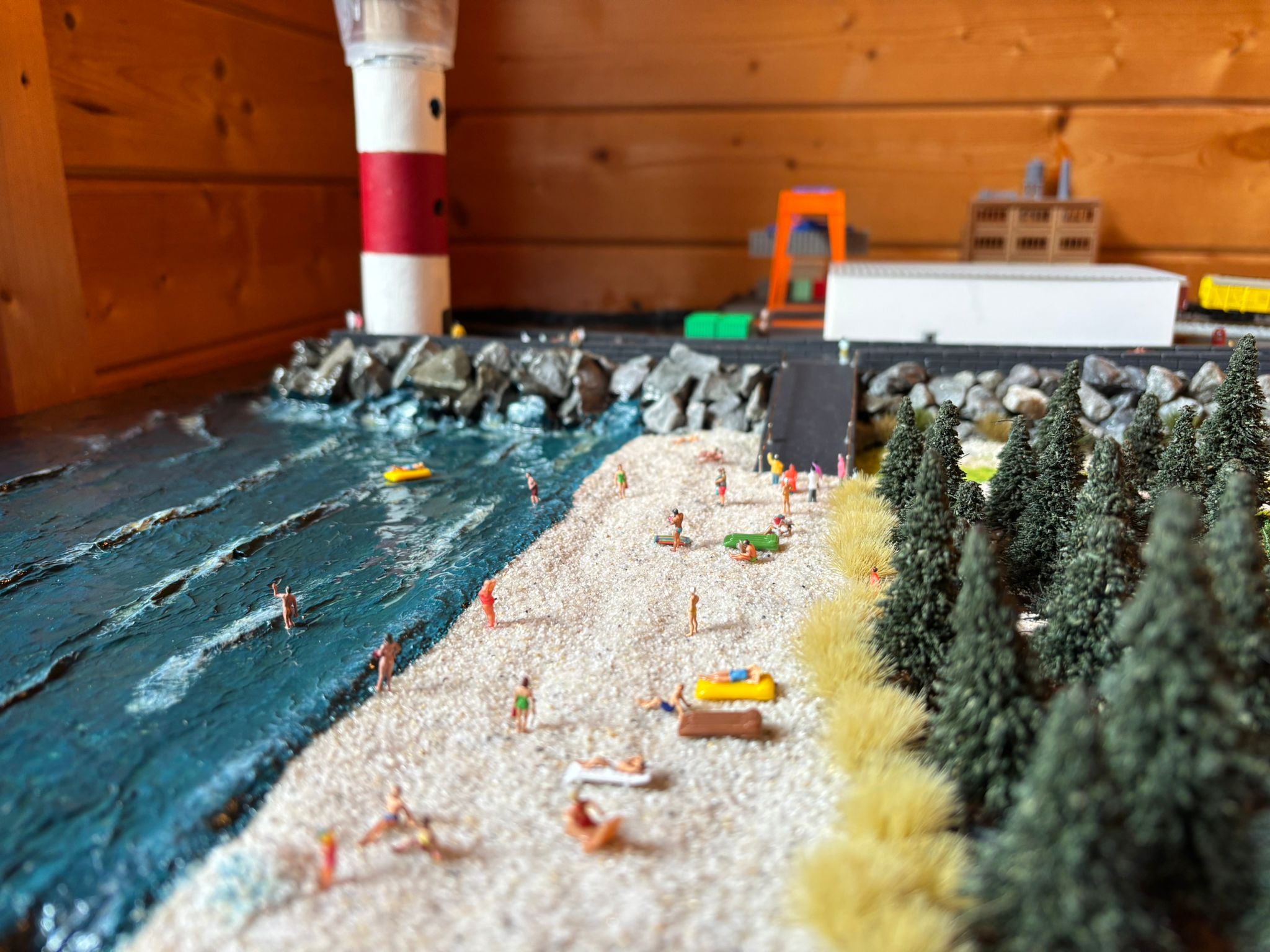 Ins Wasser eintauchen und die Figuren am Strand beneiden. Der Zug kann die Passagiere in der Nähe des Strandes abladen. Ein paar Nackedeis sind auch unter sich und lassen keine weißen Streifen zu. und keine Spanner. Das ist an sich schon spannend. Sie sind ja schön anzusehen, aber nicht ganz so schön wie das modellierte Wasser, das an Natürlichkeit fast nicht zu wünschen übrig lässt. Es ist zwar nicht so feucht wie in der Wirklichkeit, aber die Gestaltung gaukelt uns das schöne Nass vor. Christian hat experimentiert und eine gute Lösung gefunden. Ihm haben die einfach gepinselten Gewässer auf anderen Eisenbahnplatten nicht gefallen. Seine Figuren sollten sich auf sein Nass freuen, nackt oder nicht nackt, das ist nicht die Frage. Es ist aber nur eine Frage der Zeit, dass irgendwann ein Hai auftaucht und sich der Natürlichkeit des Meeres erfreut, oder den schönen Häppchen im Wasser. Dafür kann man sich schnell gewöhnen als hungriger Hai.